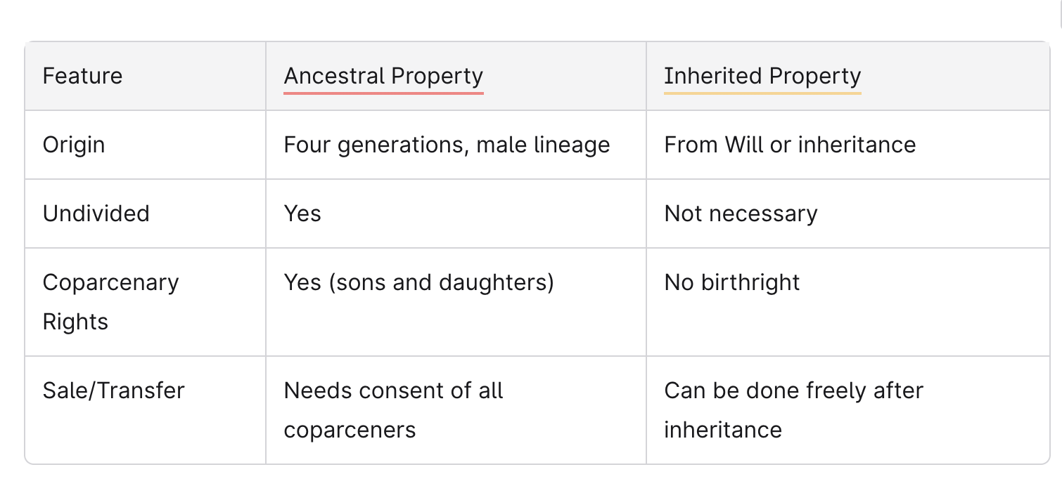 An ancestral property is a coparcenary property that has been passed down from the father’s father (and earlier generations), undivided, up to four generations.